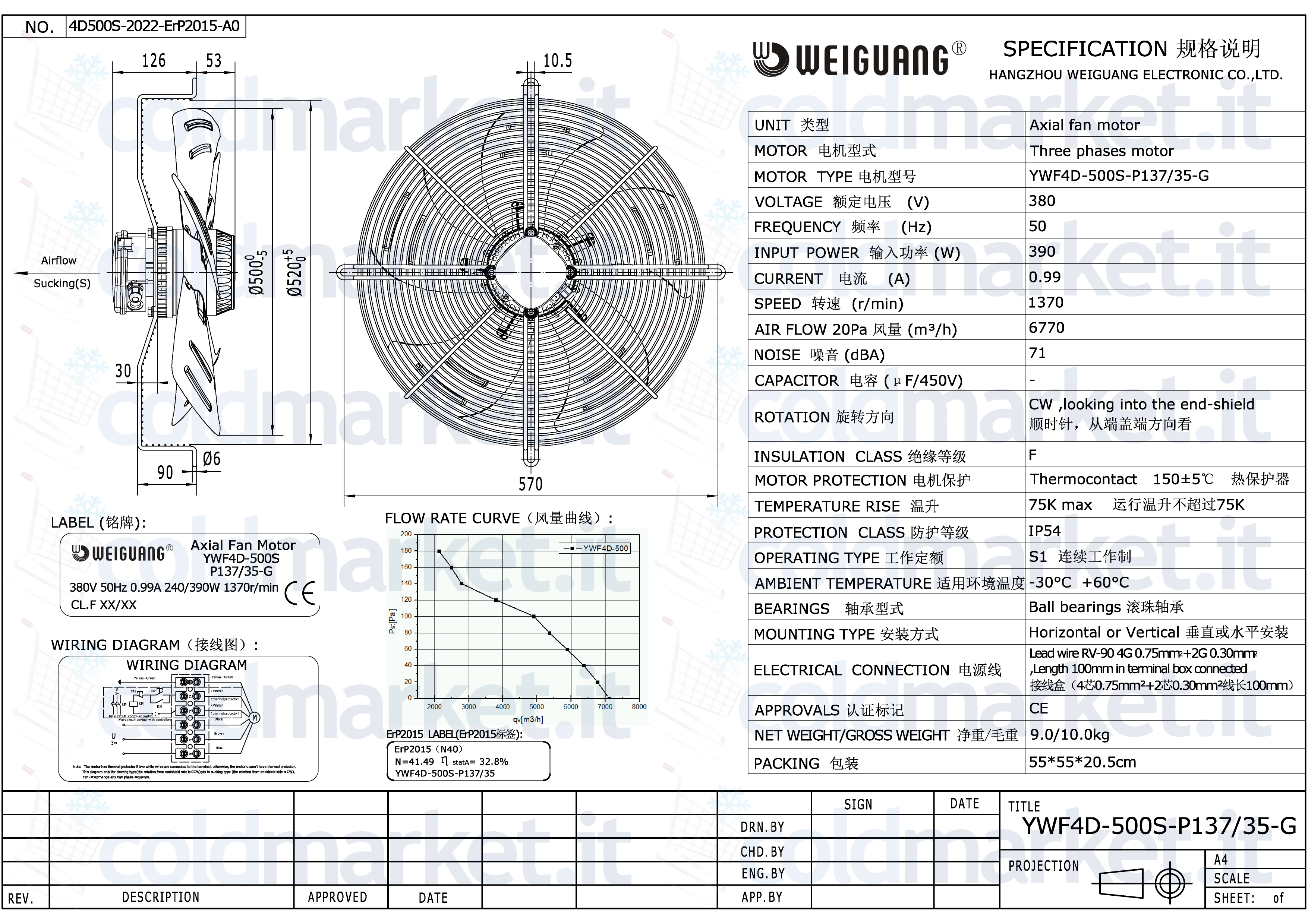 Ventilatore assiale aspirante Ø 500 mm Weiguang, alimentazione trifase 380V, velocità 1370 giri/min, grado di protezione IP54 e portata aria massima ≈ 7000 m³/h, ideale per impianti di refrigerazione, climatizzazione e ventilazione industriale ad alta potenza.
