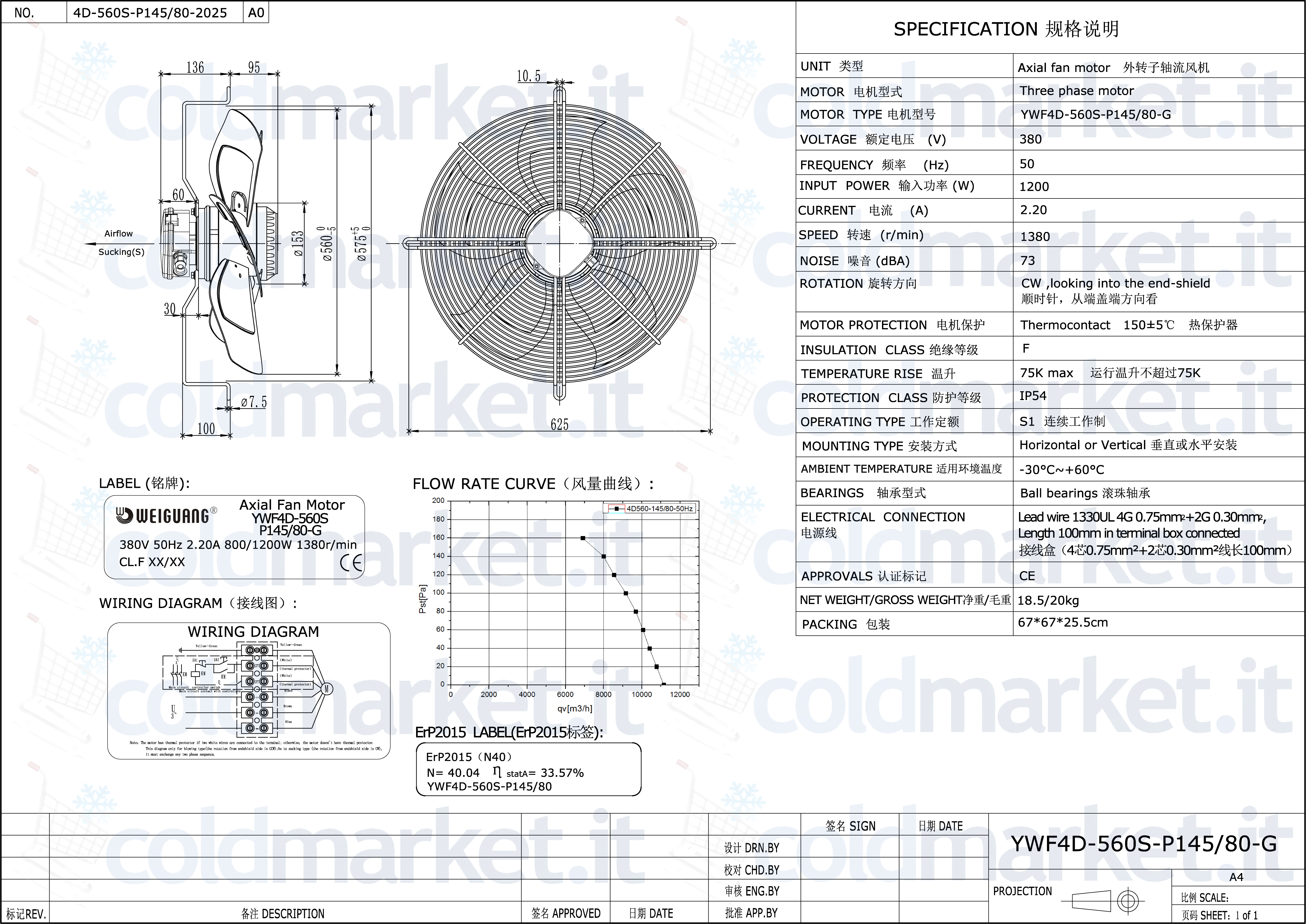 Ventilatore Assiale Ø 560 mm Aspirante Trifase 380V 1380 giri/min Weiguang YWF4D-560S-P145L80-G