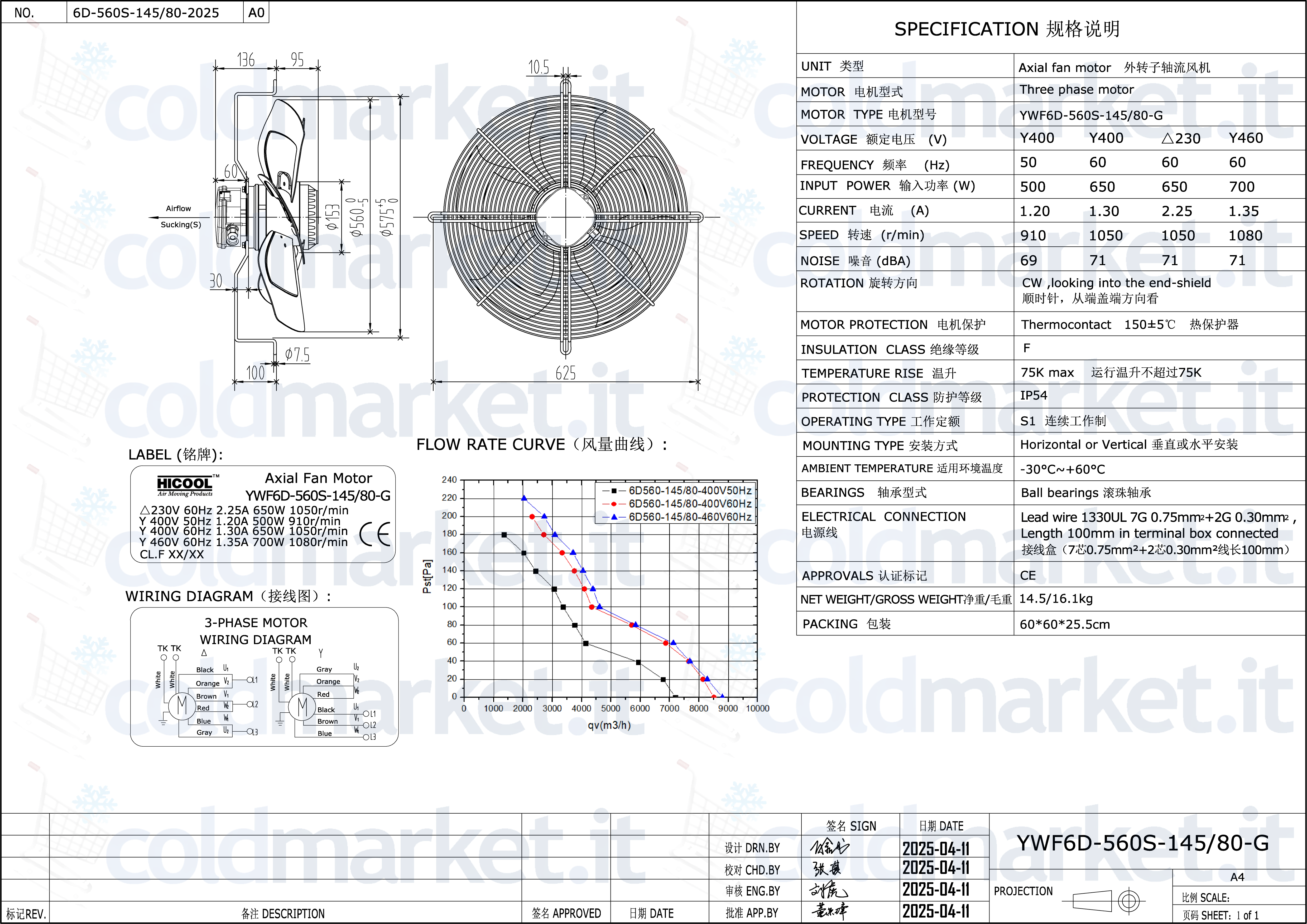 Ventilatore assiale aspirante Ø 560 mm Weiguang, alimentazione trifase 400V, velocità 910 giri/min, grado di protezione IP54 e portata aria elevata, ideale per impianti HVAC, refrigerazione commerciale e industriale.